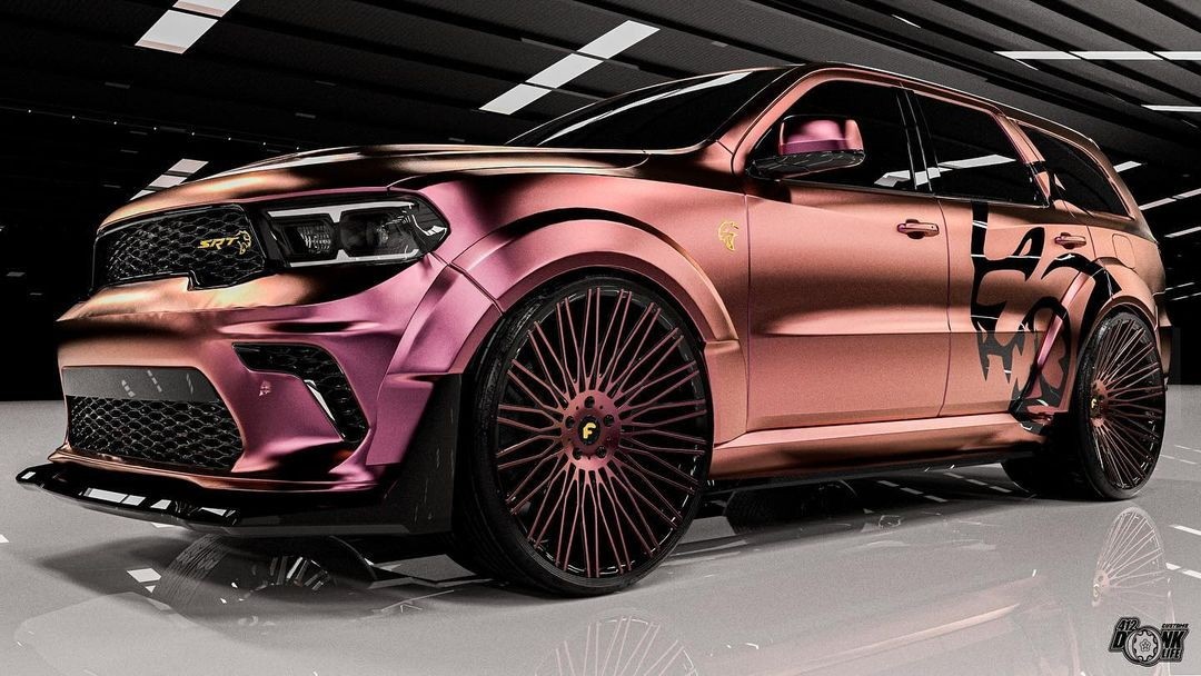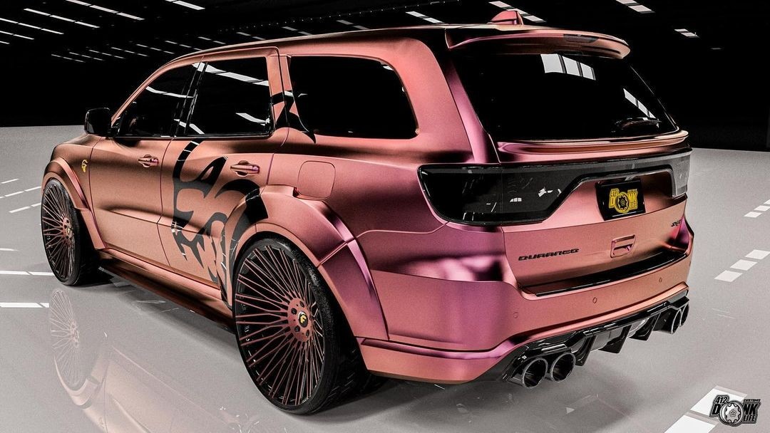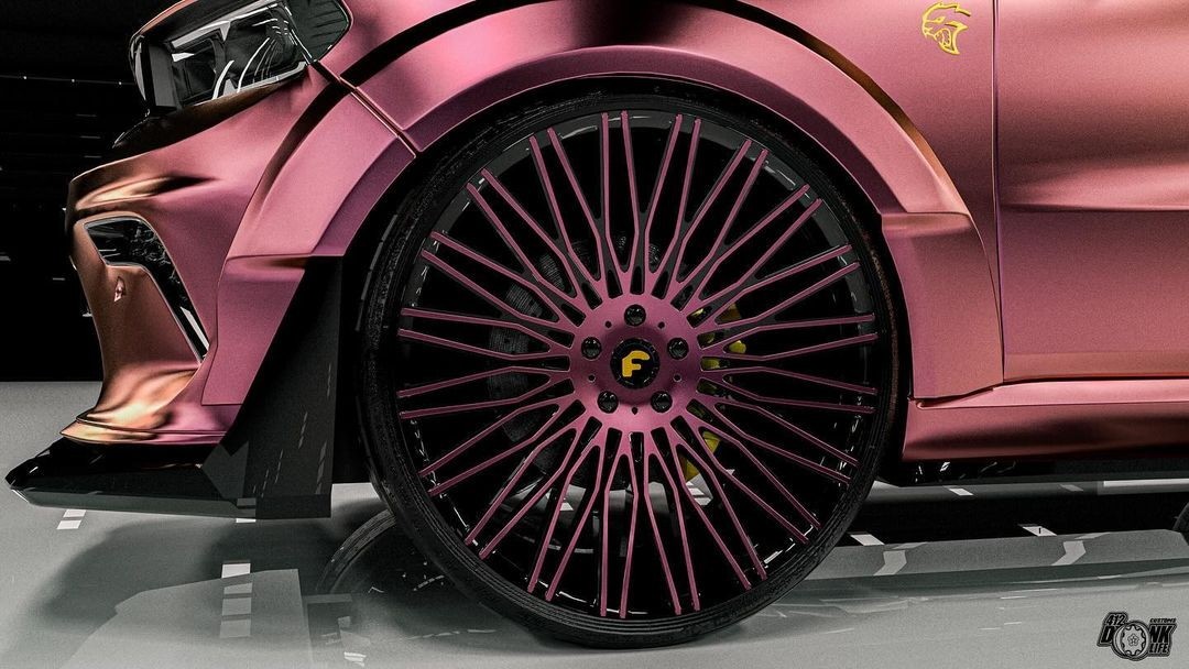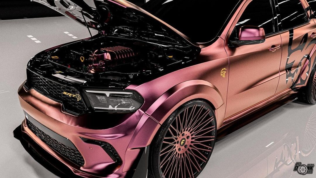 Le véhicule en question arbore une transformation en version « widebody », des unités d’éclairage teintées, un ensemble de suppression de chrome et une enveloppe personnalisée d’un aspect légèrement rosé. Il porte fièrement le logo Hellcat sur les portes arrière, des vitres teintées pour préserver l’intimité de l’habitacle, ainsi qu’une paire de grandes jantes signées Forgiato chaussées de pneus à flancs tendus pour s’insérer sous les passages de roues sans être coupés.
