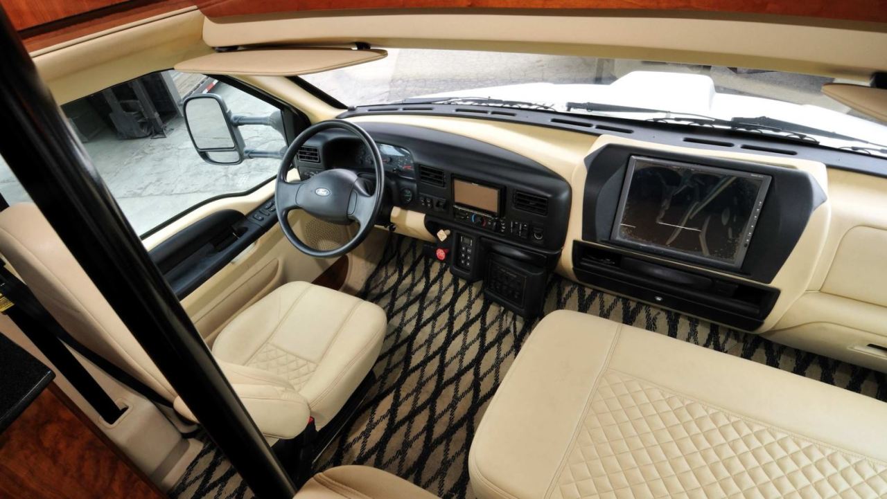 Malgré sa taille massive et son extérieur semblable à un camion Monster, l’intérieur du World Cruiser offre une série de conforts que l’on trouve couramment dans les grands camping-cars américains. Les passagers sont accueillis avec une moquette en forme de losange et une sellerie en cuir beige qui recouvre les sièges, le tableau de bord et les portes. Le salon dispose d’une télévision à écran plat comme pièce maîtresse, tandis que la cuisine est équipée d’un four, d’un évier et d’une douche avec eau chaude sans propane dans la salle de bain.