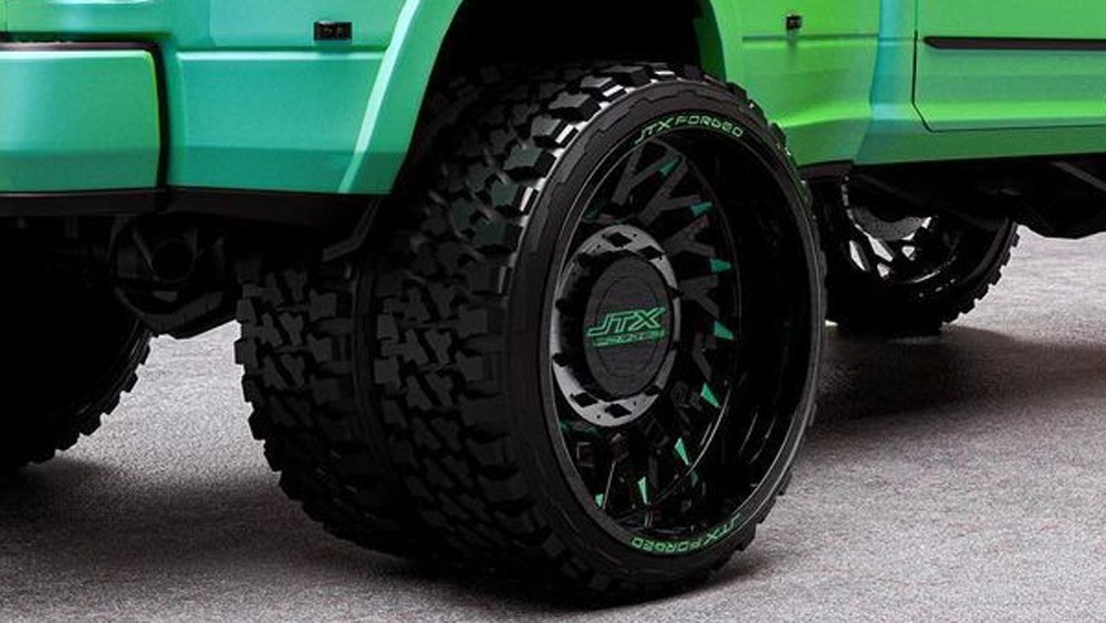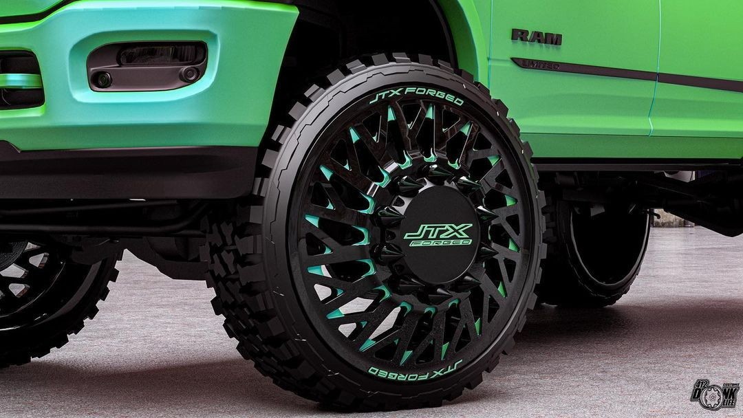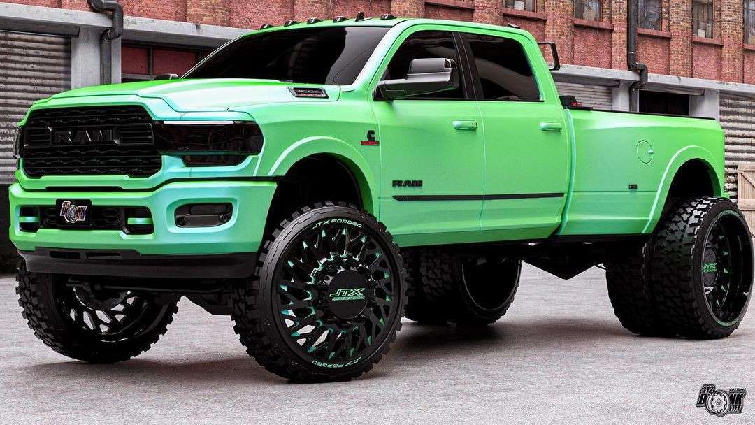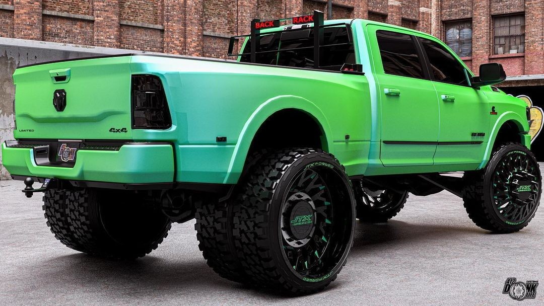 Mais la véritable caractéristique remarquable de ce Ram 3500 est sa garde au sol massive et ses roues de 32 pouces. Le pickup est surélevé du sol, ce qui le rend difficile à monter et à descendre, mais lui permet de franchir facilement de gros obstacles. Les jantes noires et menthe correspondent parfaitement à la finition du camion, et les pneus fins leur permettent de se glisser sous les arches sans aucun problème.