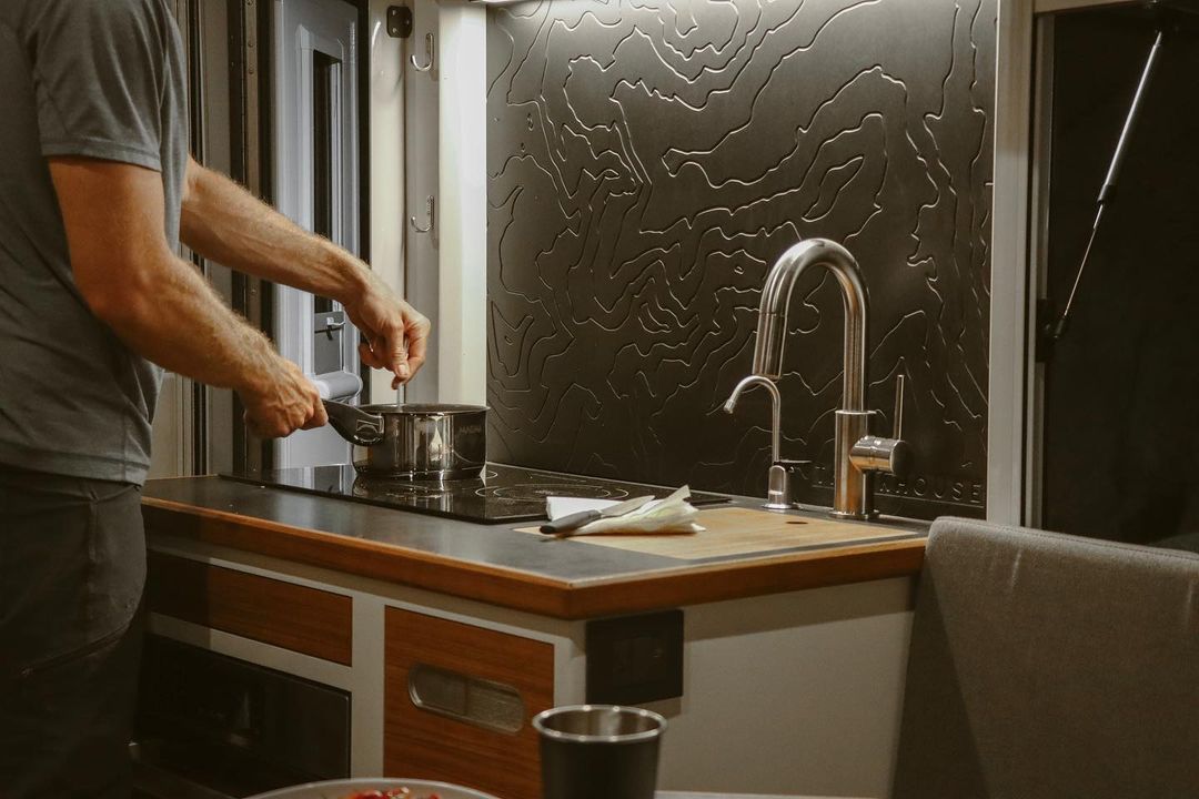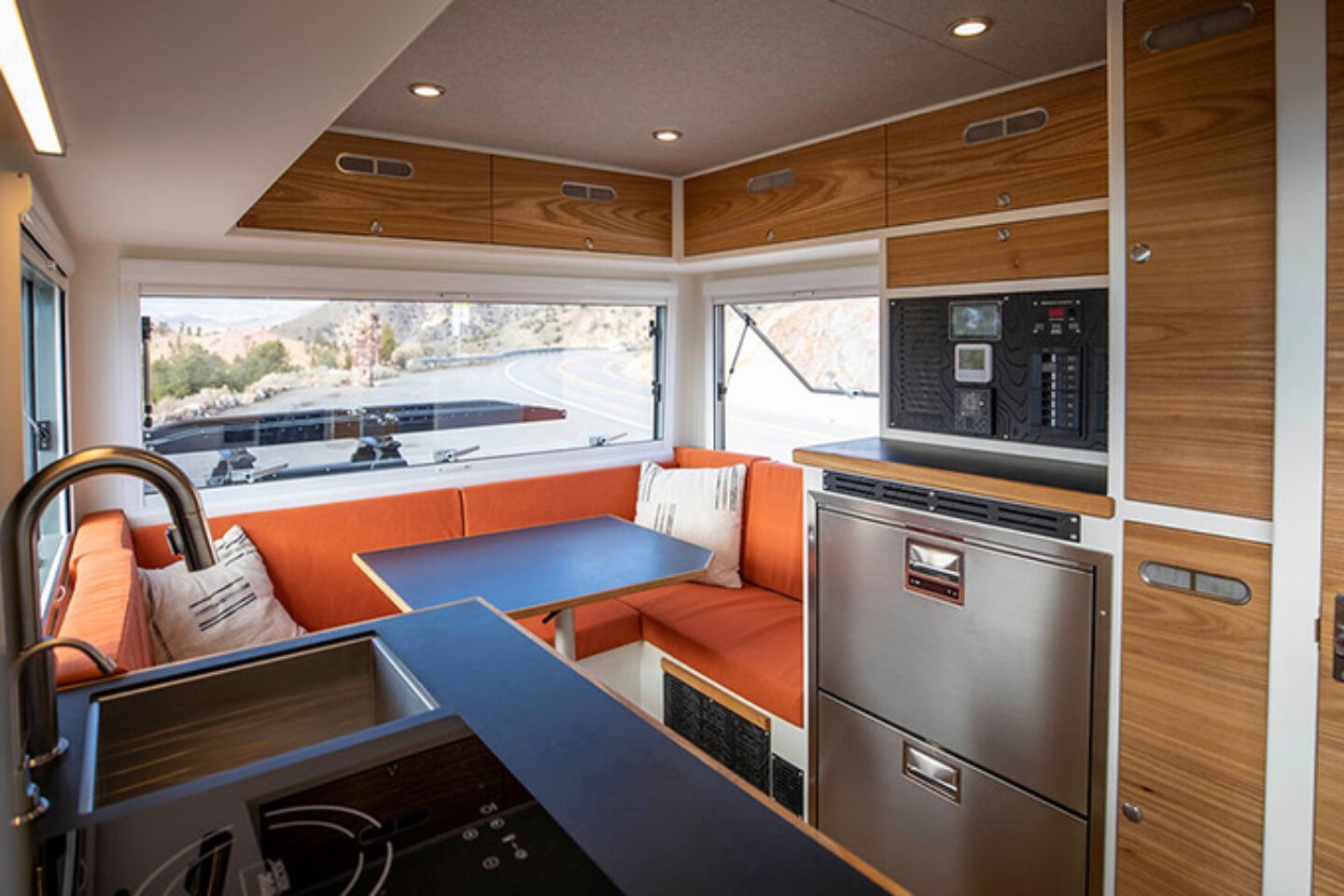 La dinette en forme de U est entourée d’immenses fenêtres, permettant une vue presque panoramique sur les environs. Vous trouverez également un grand coin cuisine équipé d’une plaque de cuisson à induction, d’un four à convection, d’un réfrigérateur/congélateur deux tiroirs, d’un évier et d’un micro-ondes. Il n’est pas question de douche, mais les futurs propriétaires ont le choix entre trois options de système de toilettes : à cassette, à chasse d’eau sèche ou à compost.