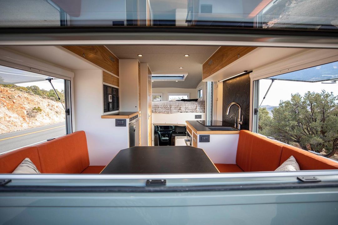 L’intérieur du camping-car est une véritable maison sur roues, privilégiant le luxe et la fonctionnalité. Il présente une conception ouverte et une hauteur debout de 6’6″ (1,98 mètres), il n’est donc pas nécessaire de se baisser à l’intérieur du camping-car. Il peut accueillir jusqu’à quatre personnes avec un lit capucine king-size et un coin repas en forme de U à l’arrière peut se transformer en lit double. Ceux qui dorment dans la capucine peuvent également observer les étoiles la nuit à travers la grande lucarne/trappe au-dessus du lit.